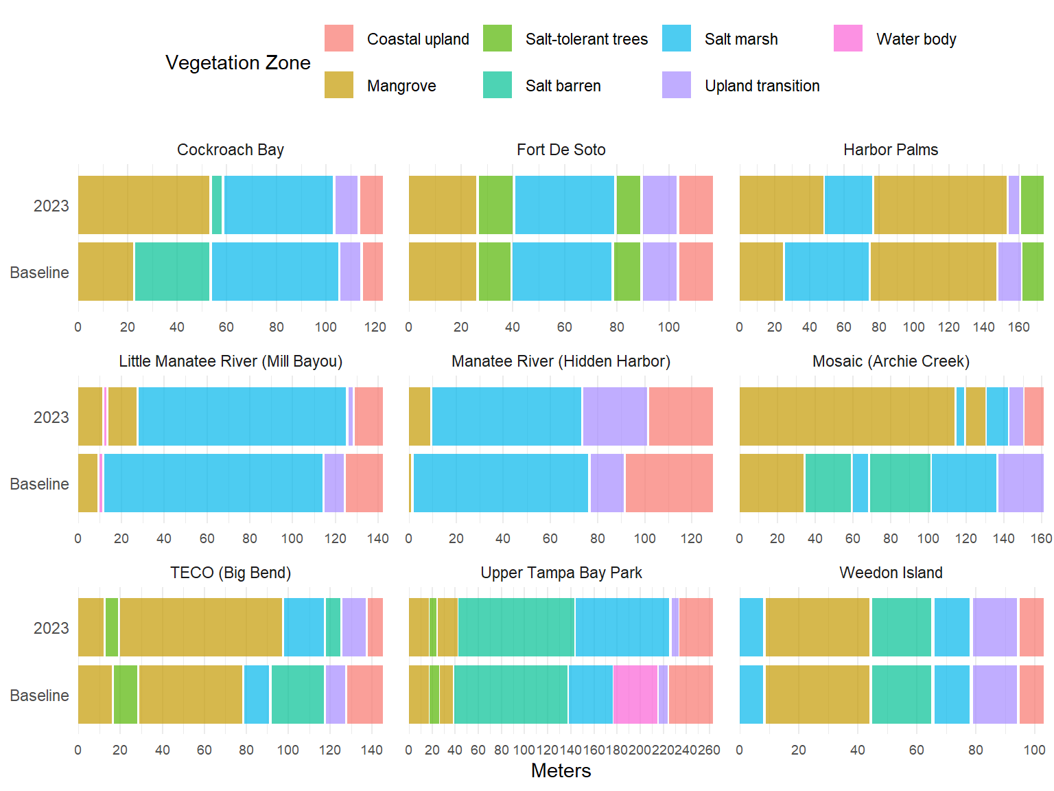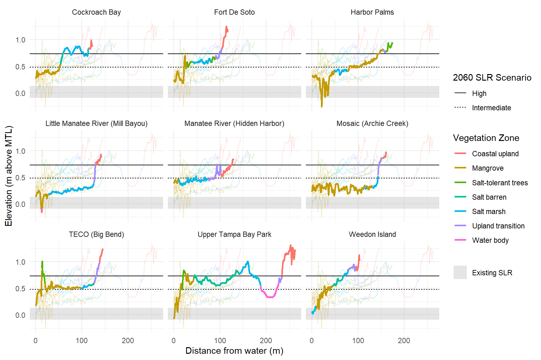 p <- ggplot(toplo, aes(x = Meter, y = Elevation_MTL, color = Simplified_zone_name, group = zone_group)) +
