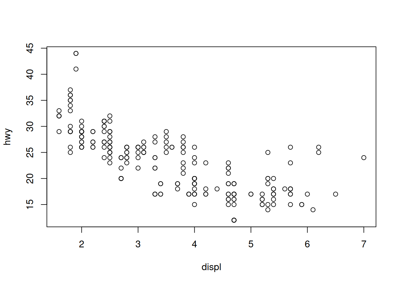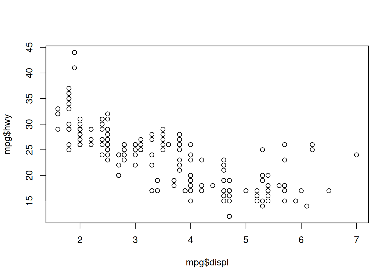 plot(hwy ~ displ, data = mpg)4 Data viz