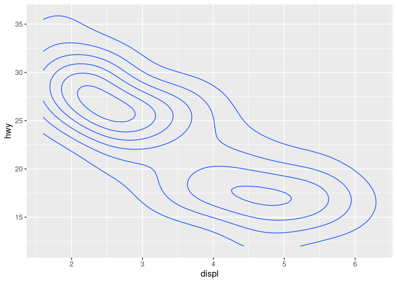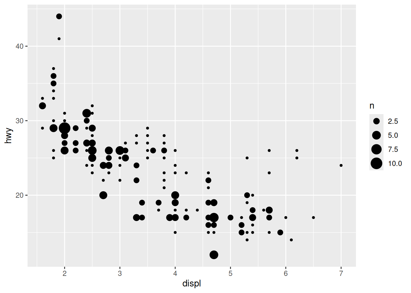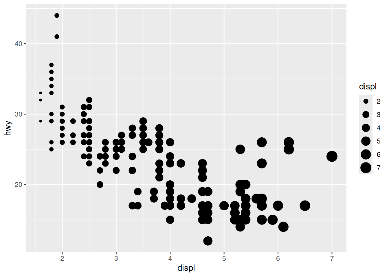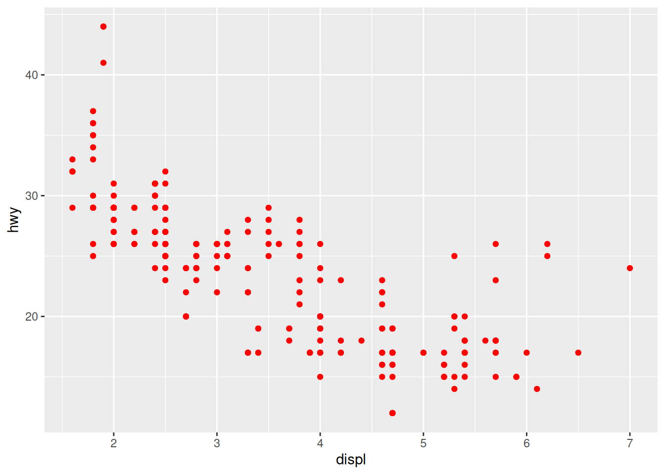 ggplot(mpg, aes(x = displ, y = hwy)) +