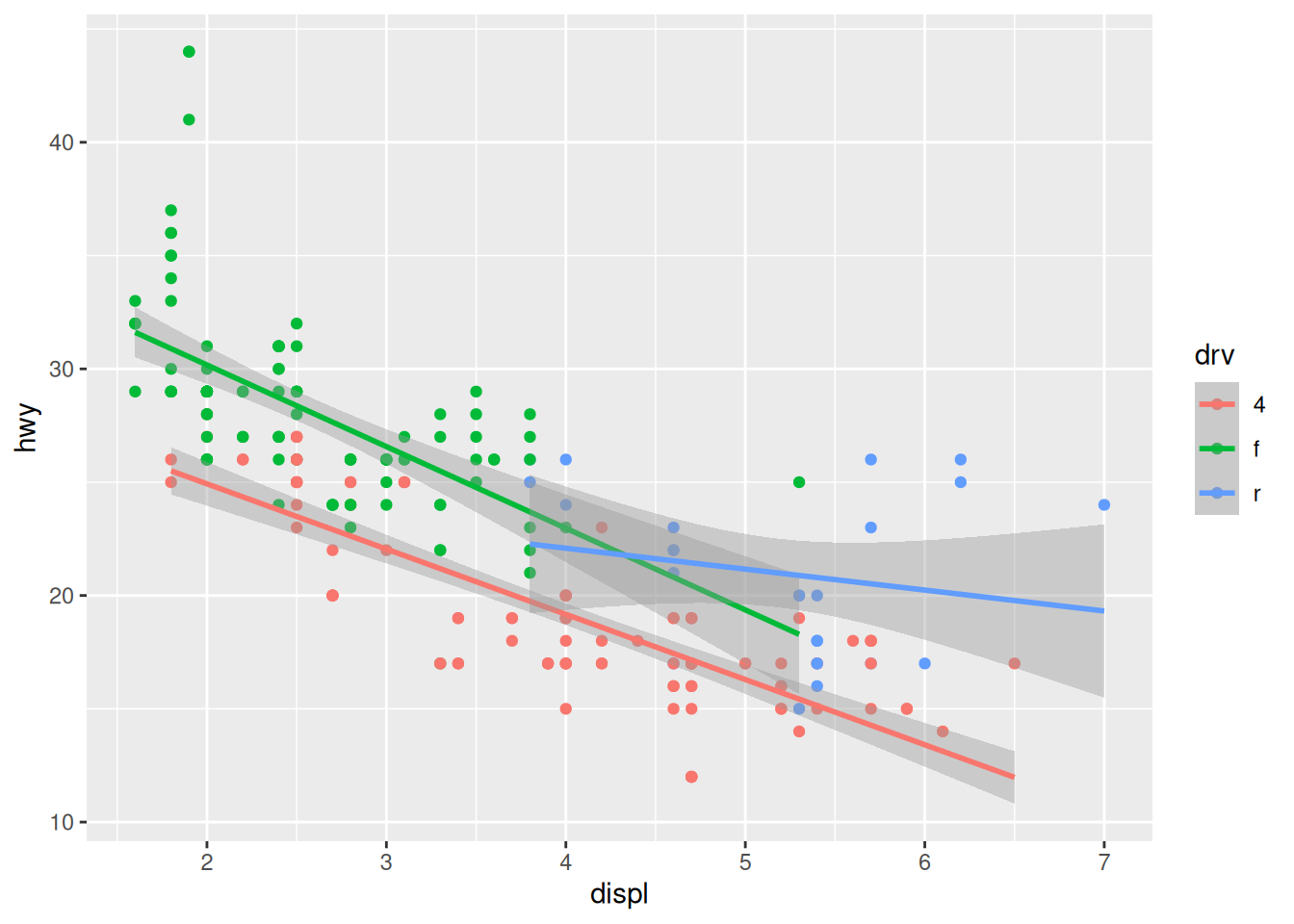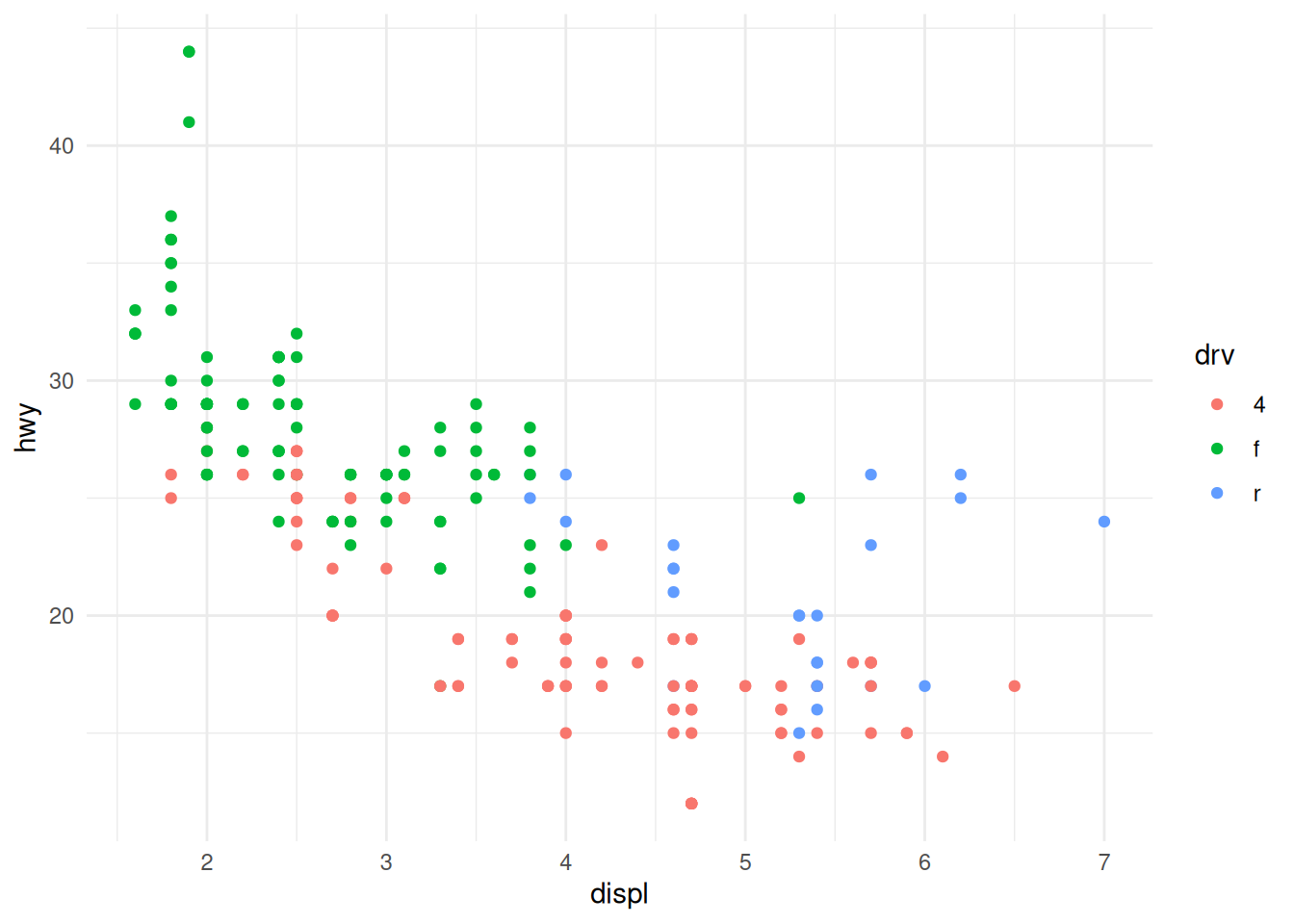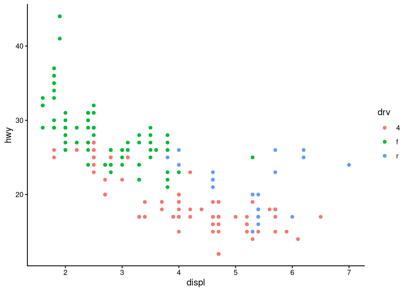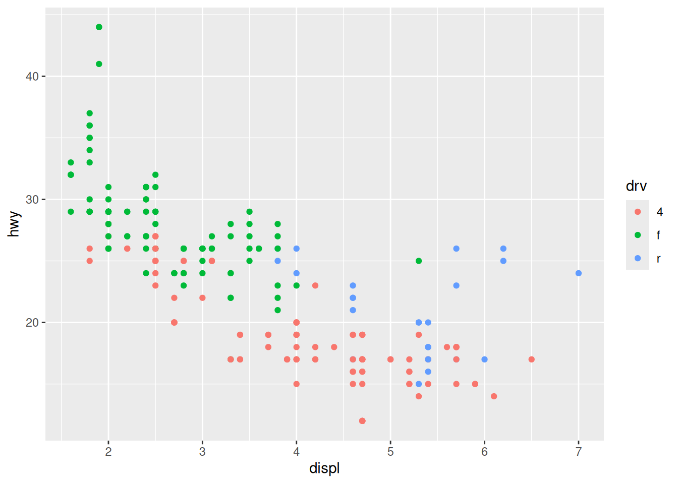 ggplot(mpg, aes(x = displ, y = hwy, colour = drv)) +