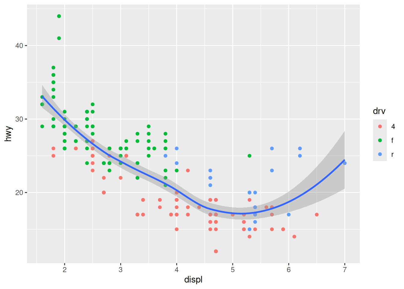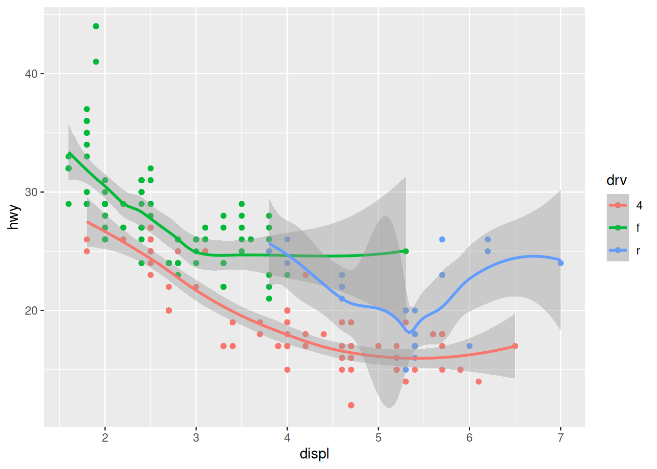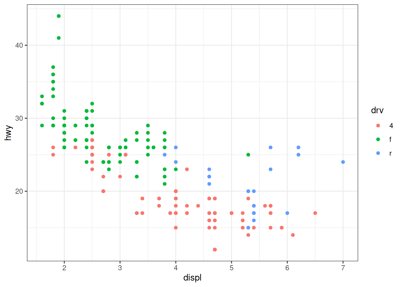 ggplot(mpg, aes(x = displ, y = hwy, colour = drv)) +