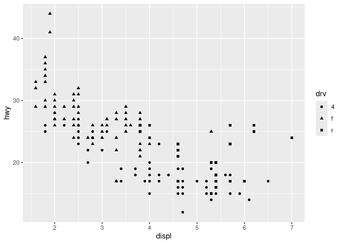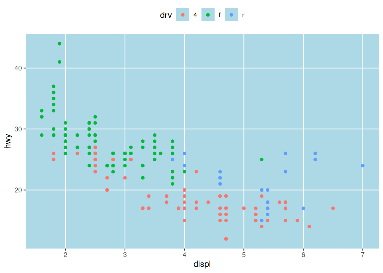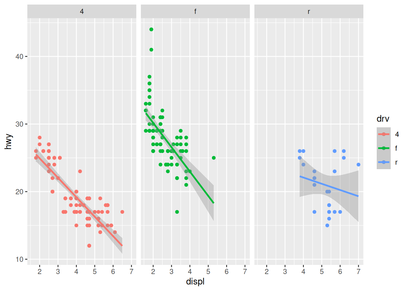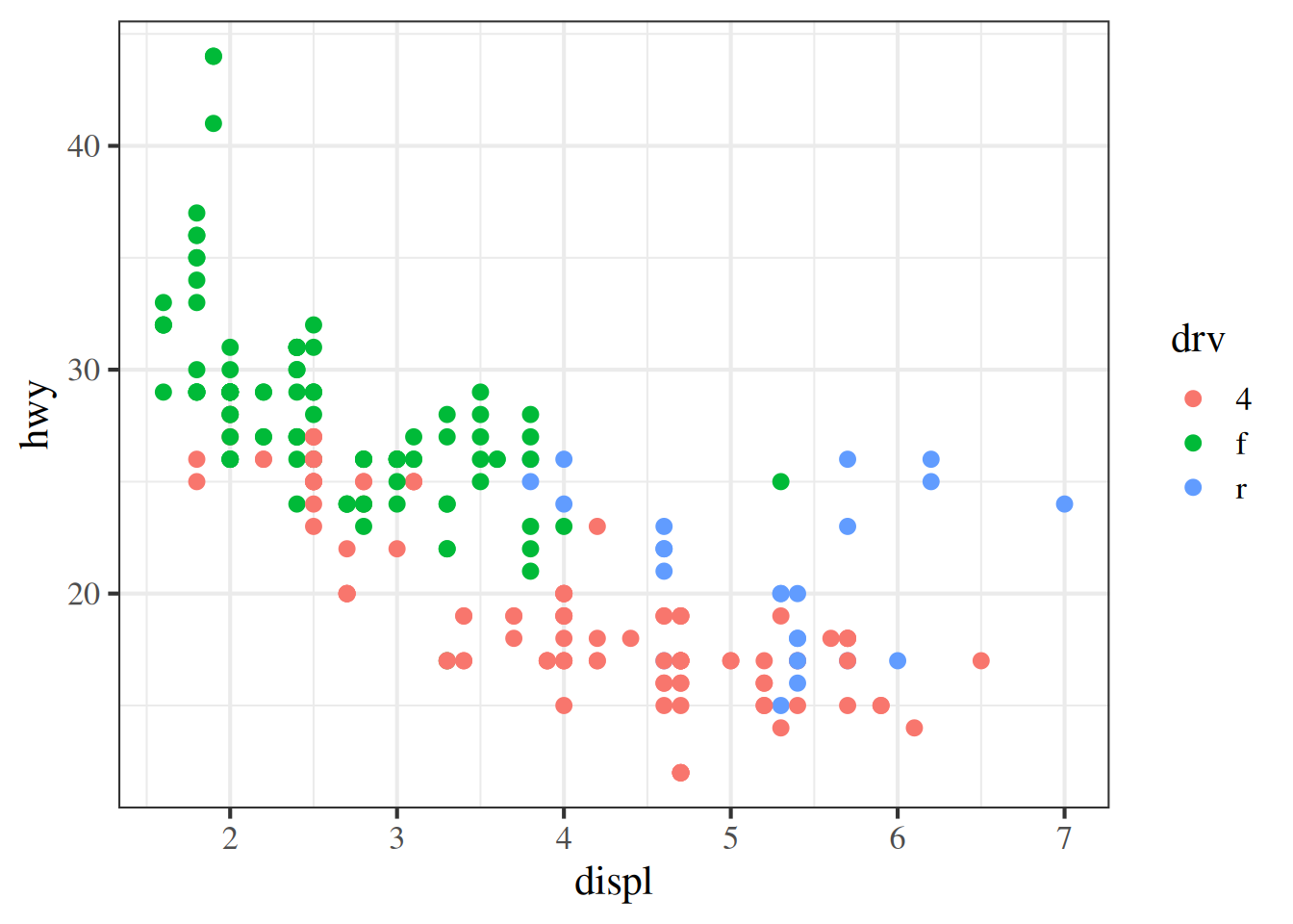 ggplot(mpg, aes(x = displ, y = hwy, colour = drv)) +