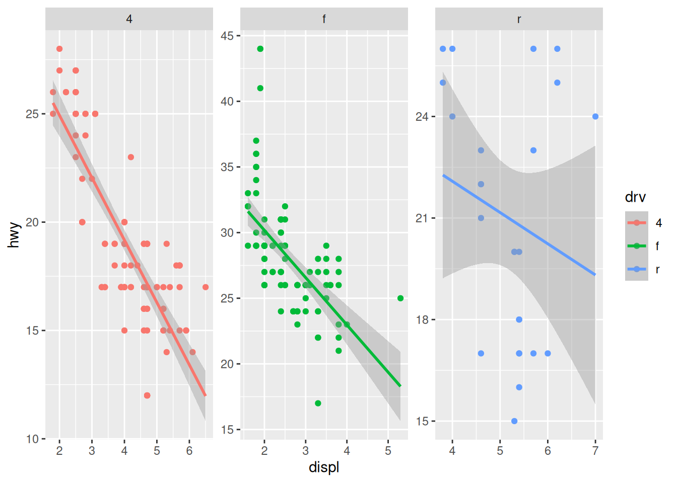 facet_wrap(~ drv, ncol = 3)The scales argument is also a useful part of facet_wrap. By default, the x and y axes are fixed between the panels. You can change this behavior by using scales = "free". Be careful using this feature because it can lead to different interpretations of the magnitude of trends.