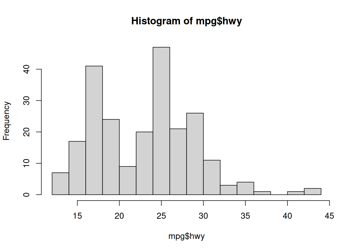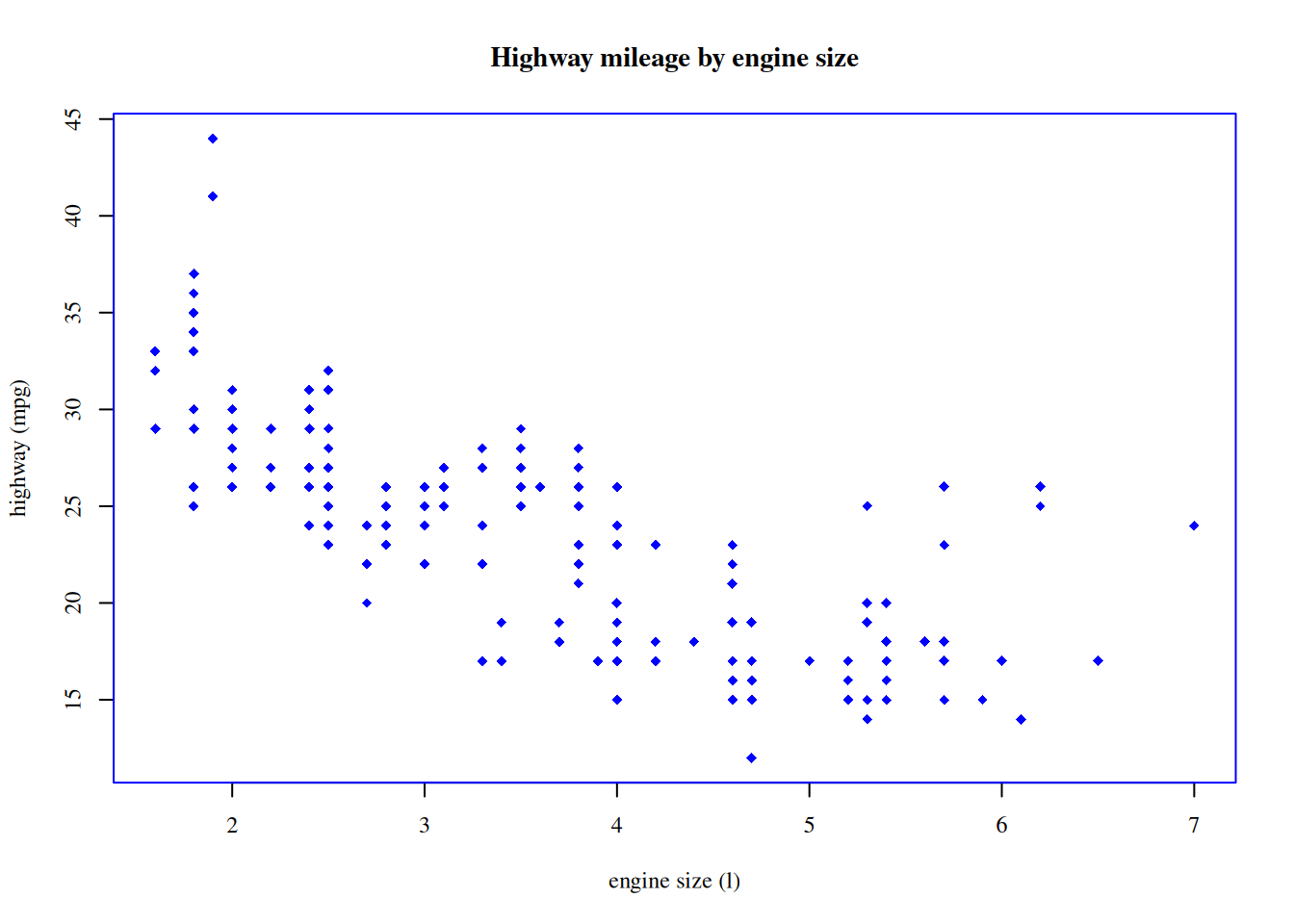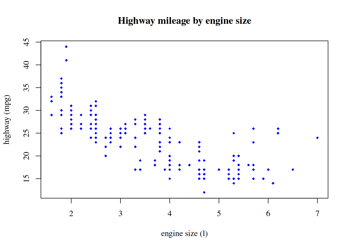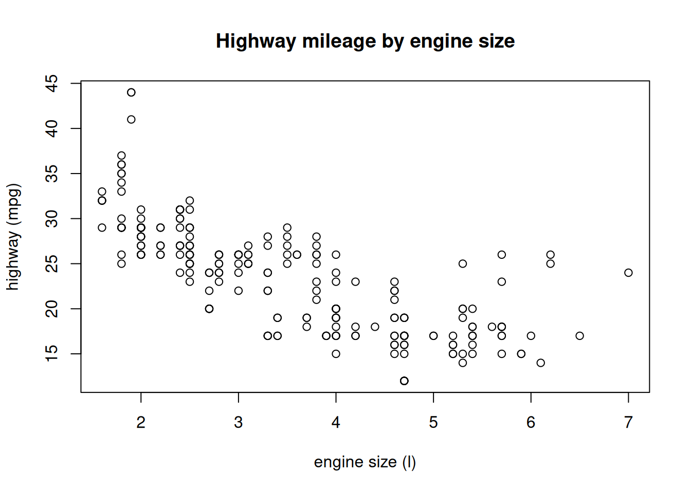 plot(hwy ~ displ, data = mpg, main = 'Highway mileage by engine size',