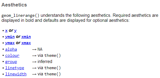 and ymax or xmin and xmax.Oh snap, what happened? This error is telling us that the geom we just tried is missing some required aesthetics in the plot. Here we’ve only used the x and y aesthetics but it looks like it requires ymin and ymax. Lets look at the help file for geom_linerange.