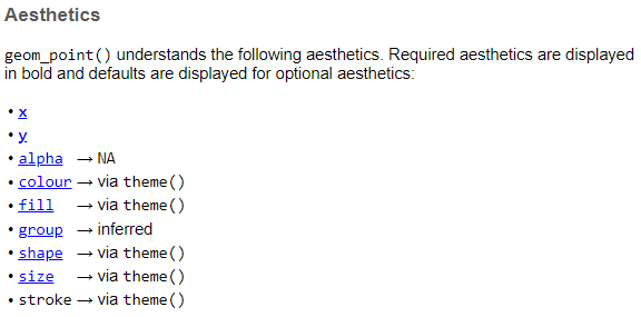 ?geom_pointWe’ve got the required aesthetics in our plot. Let’s add some others that we can use with geom_point.
