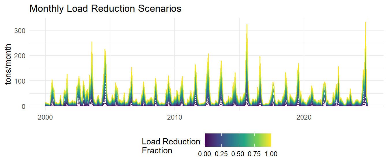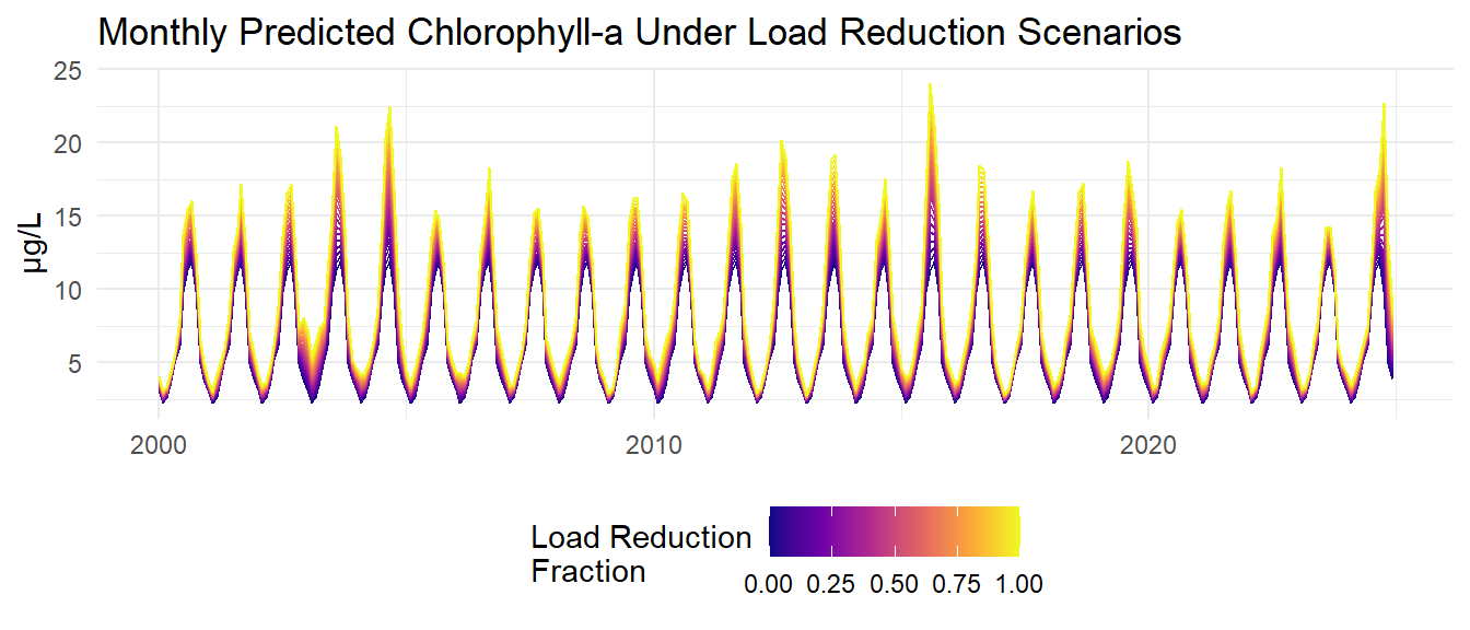 Monthly and annual model predictions are then generated for various nitrogen load reduction scenarios using the new log-model with additional predictors. Monthly loads are reduced by fractions ranging from 0% to 100% in 5% increments. The models are then used to predict chlorophyll-a concentrations under each load reduction scenario. Salinity and temperature are held constant at their monthly average values for each month across the entire time series.