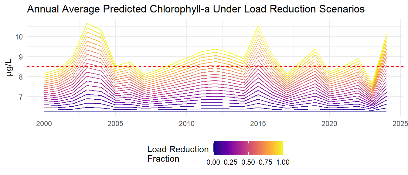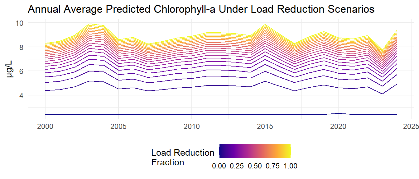 Monthly model predictions are then aggregated to annual average predicted chlorophyll-a and total nitrogen loads for each load reduction scenario.