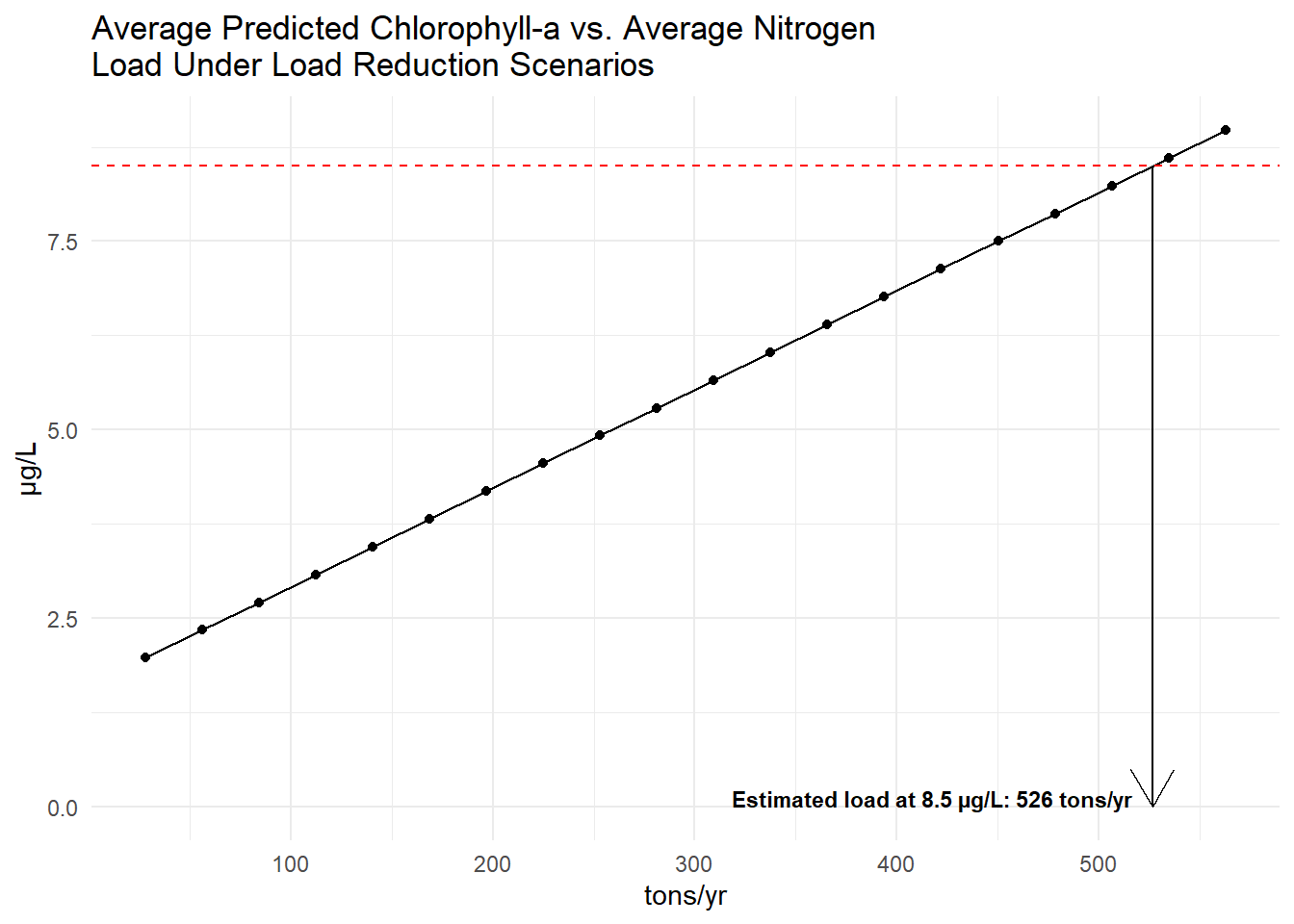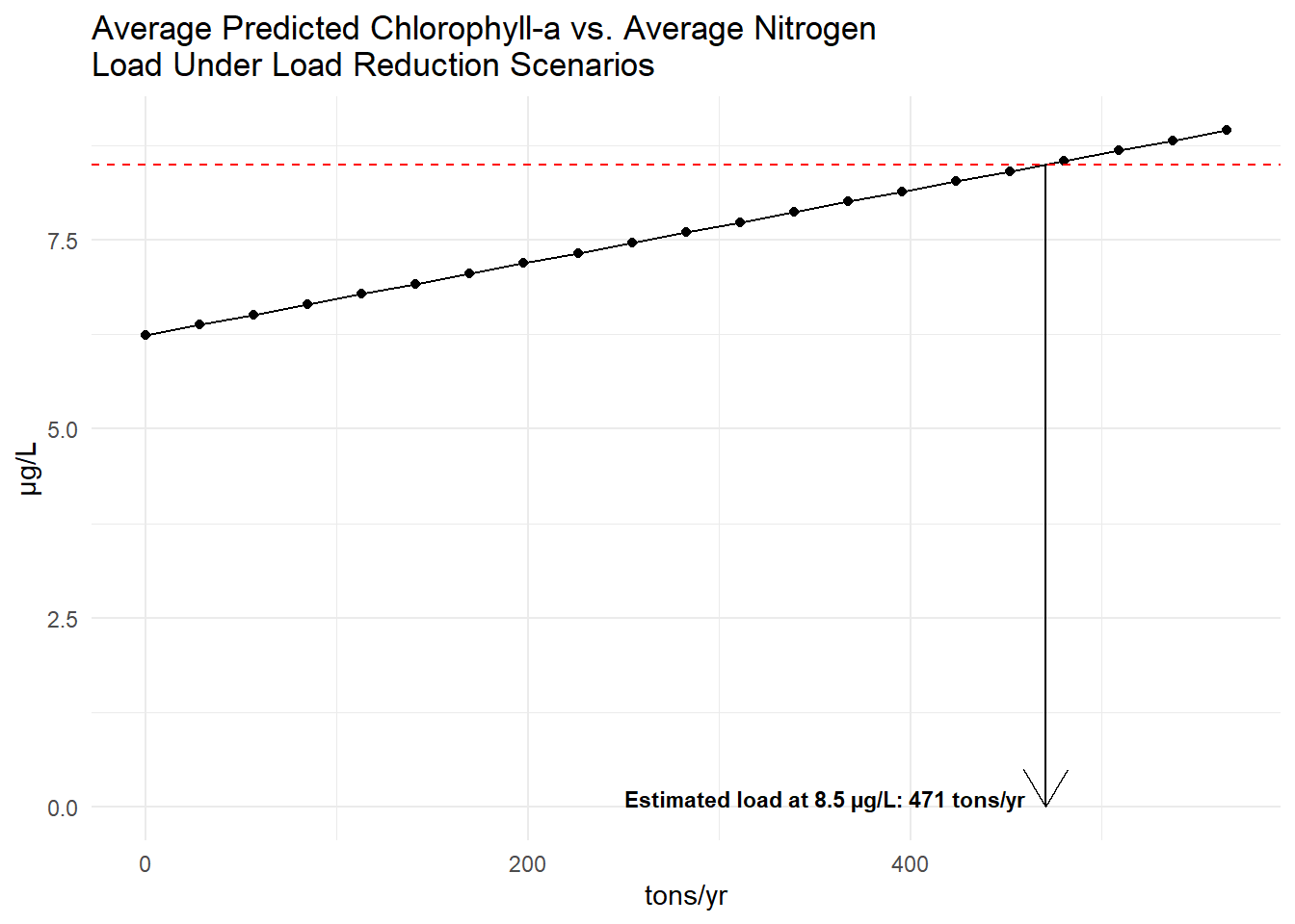 The average response of chlorophyll-a to nitrogen load changes was then estimated by taking the average of the annual chlorophyll predictions and the average load estimates for each reduction scenario. The plots below show each point as the average predicted chlorophyll-a versus the average total nitrogen load for each load reduction scenario. The dashed red line indicates the target chlorophyll-a concentration of 8.5 µg/L. The arrow indicates the estimated nitrogen load reductions needed to achieve the target chlorophyll-a concentration based on linear interpolation of the average response curves. The estimated loads needed to achieve 8.5 µg/L chlorophyll-a are 471 tons/year.