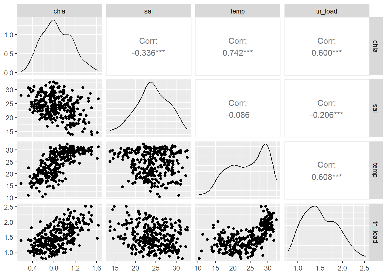 \[ log_{10}\text{chla}_{t} = \alpha_{t} + \beta_1 log_{10}\left( \Sigma_{i = I_0}^{I_n} L_{t - i} \right) + \beta_2 \text{sal}_{t} + \beta_3 \text{temp}_{t} \]