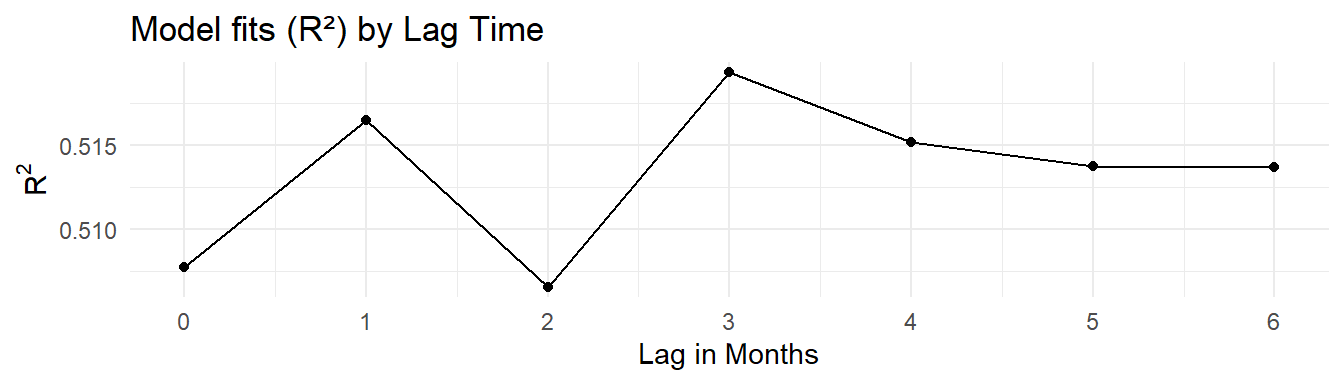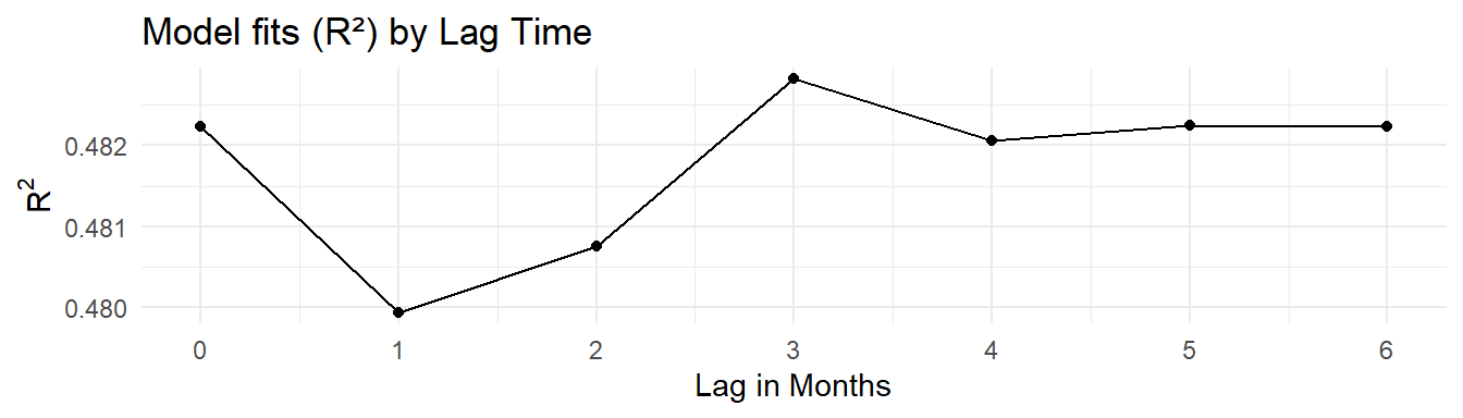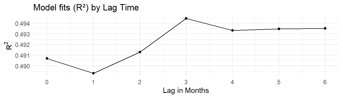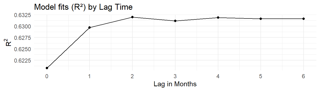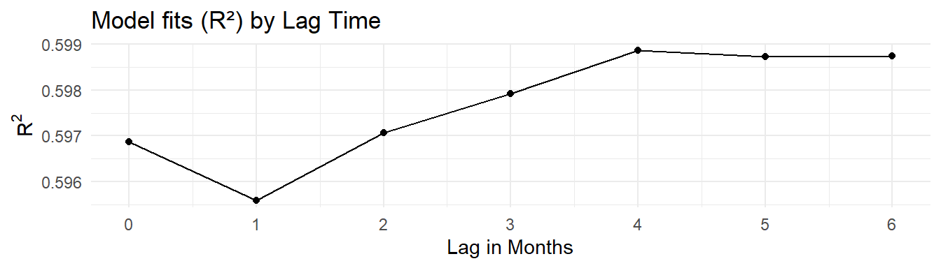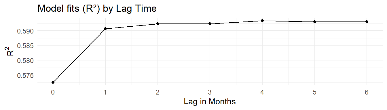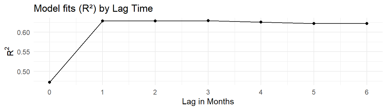 Models are created with the following linear model structure in R, where the tn_load variable is the cumulative lag load for different \(n\) lags.