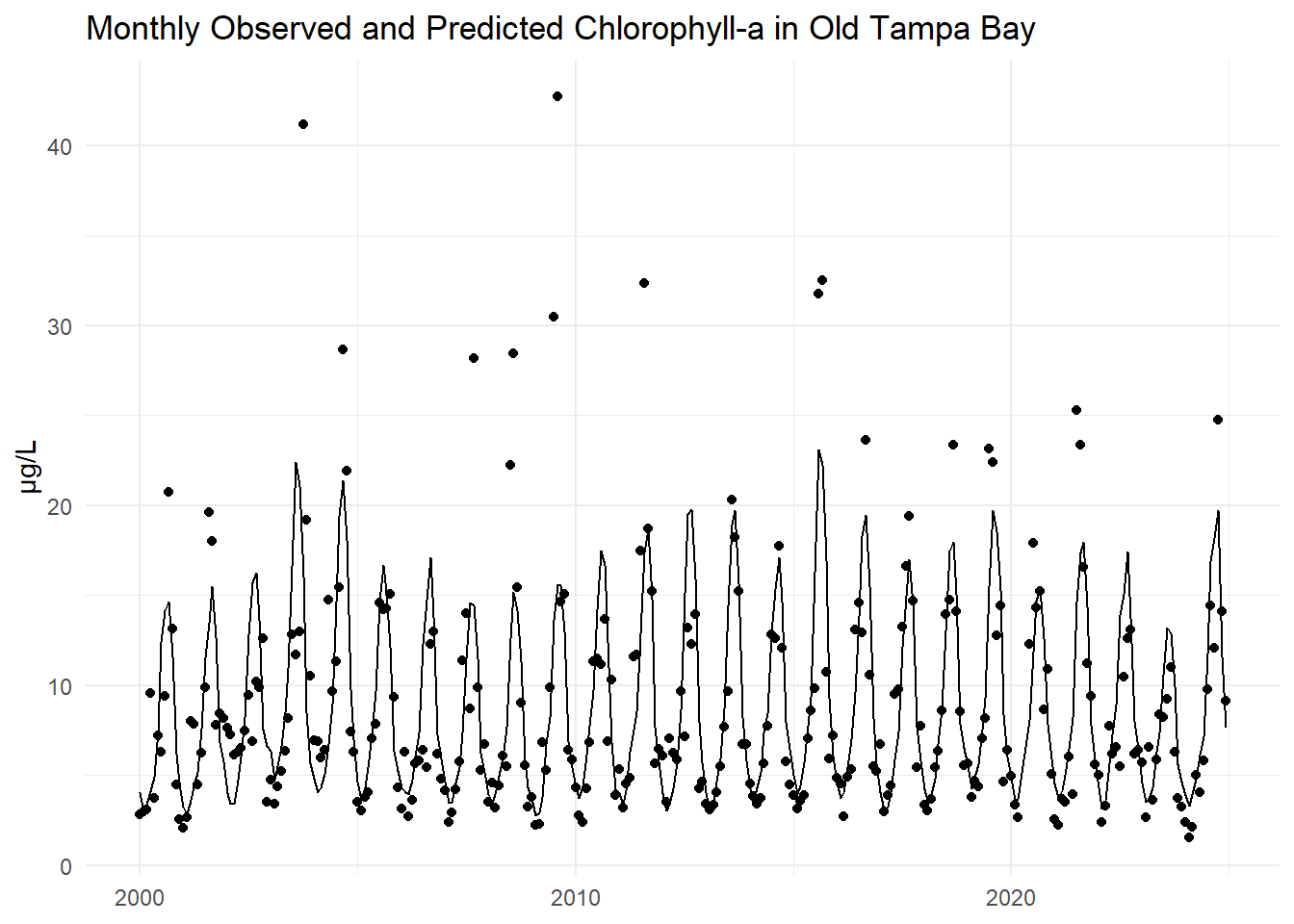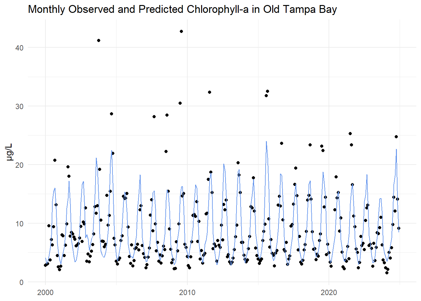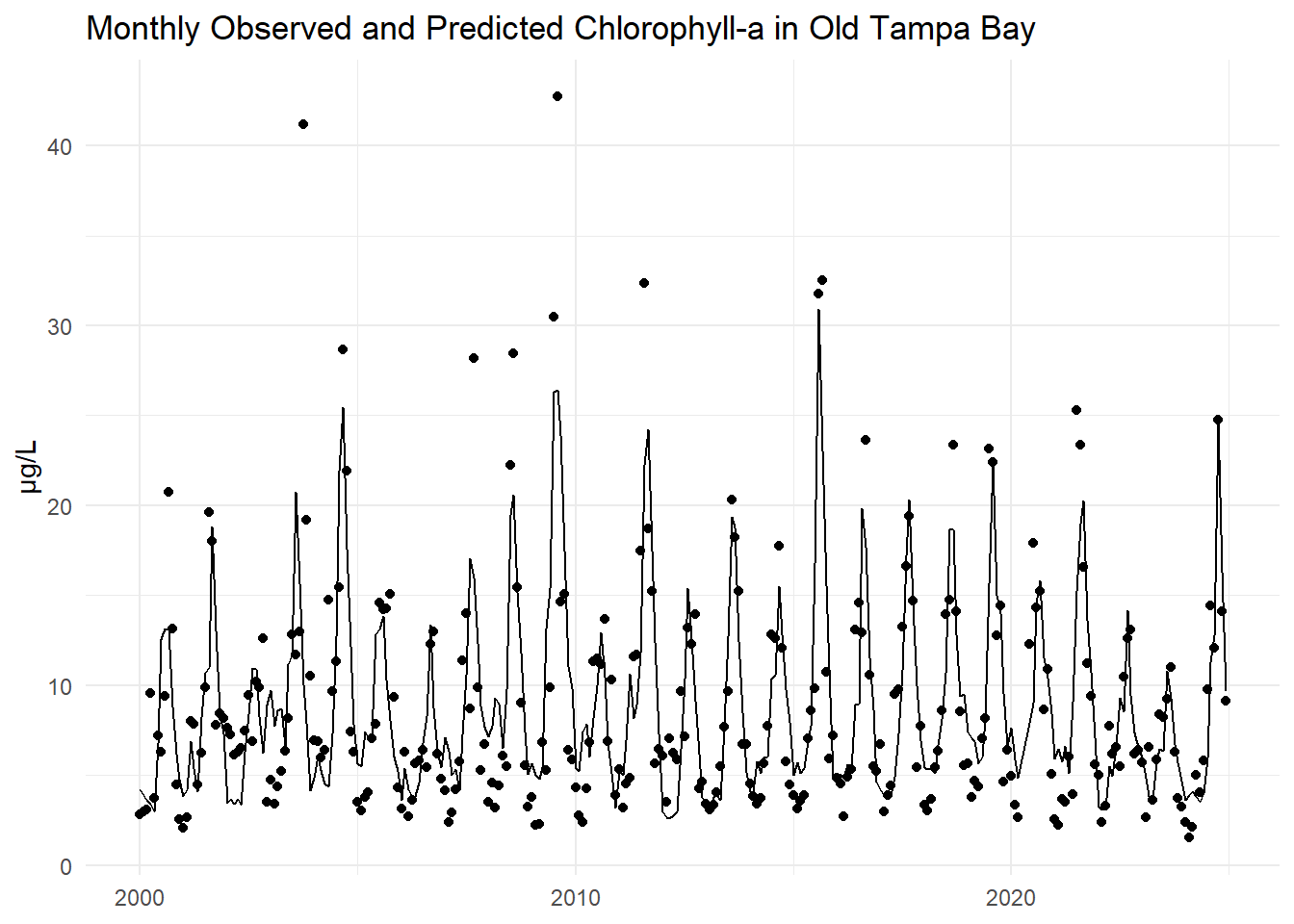 The monthly observed and predicted chlorophyll-a concentrations are compared for Old Tampa Bay below.