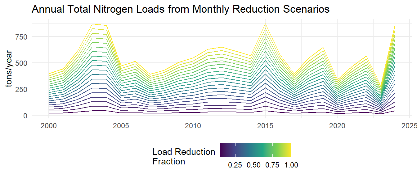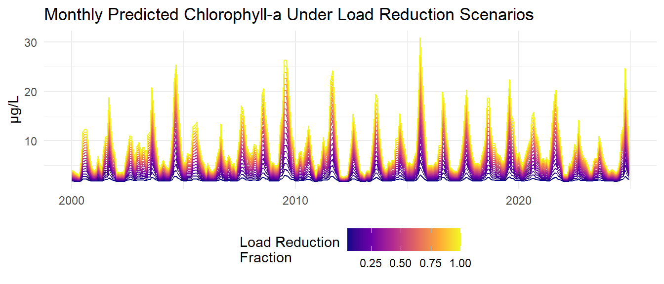 Monthly and annual model predictions are then generated for various nitrogen load reduction scenarios using the new model where the chlorophyll response to loading varies between years. Monthly loads are reduced by fractions ranging from 5% to 100% in 5% increments. The models are then used to predict chlorophyll-a concentrations under each load reduction scenario.