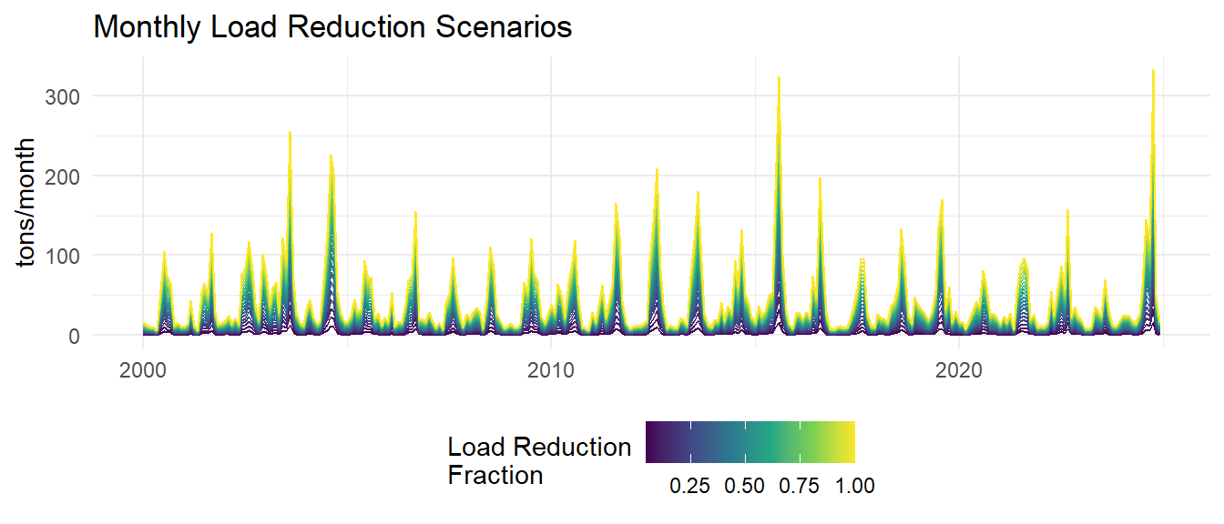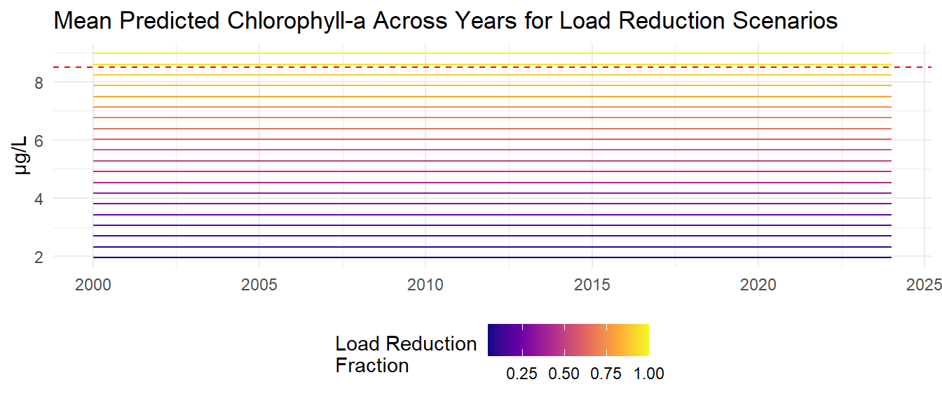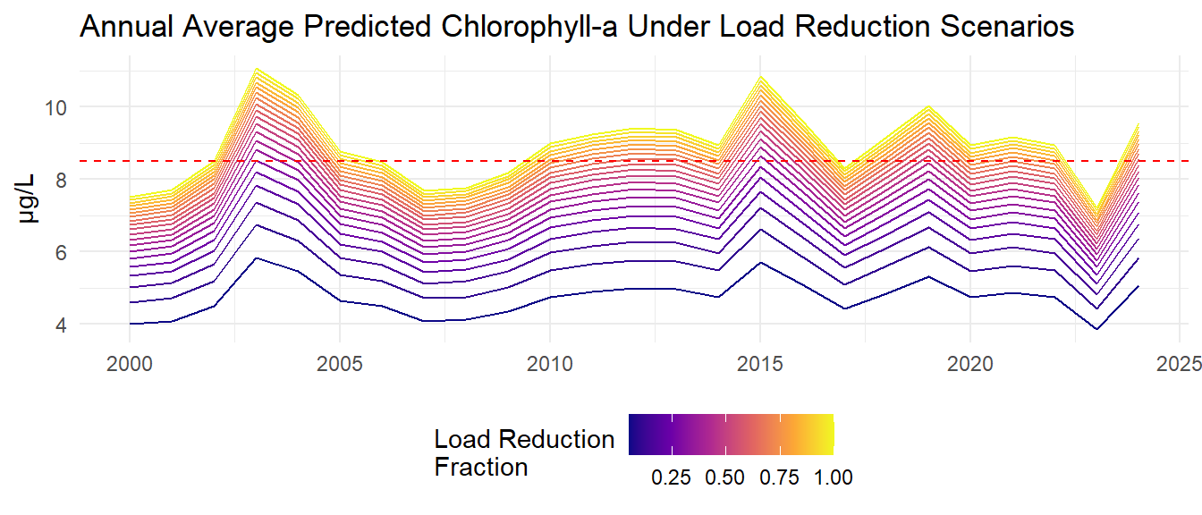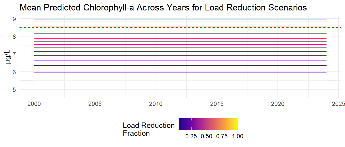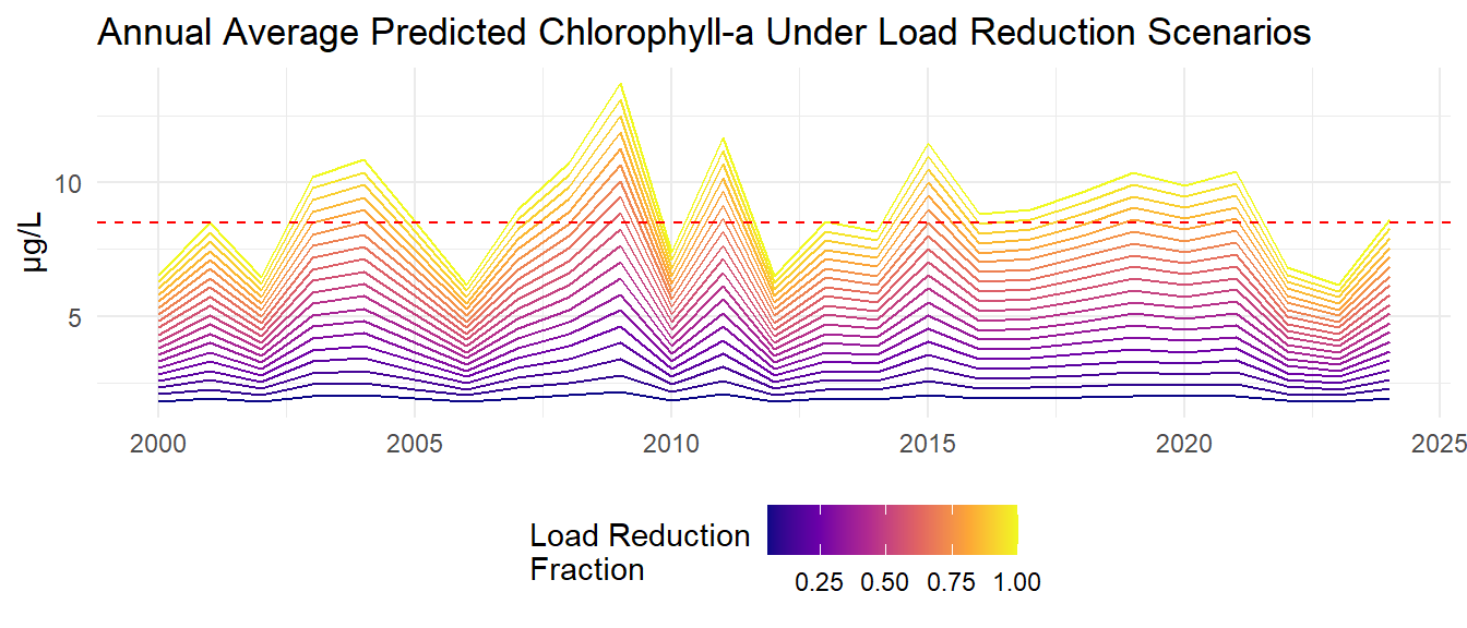 Annual load estimates and chlorophyll-a predictions for each load reduction scenario are then averaged across the years.