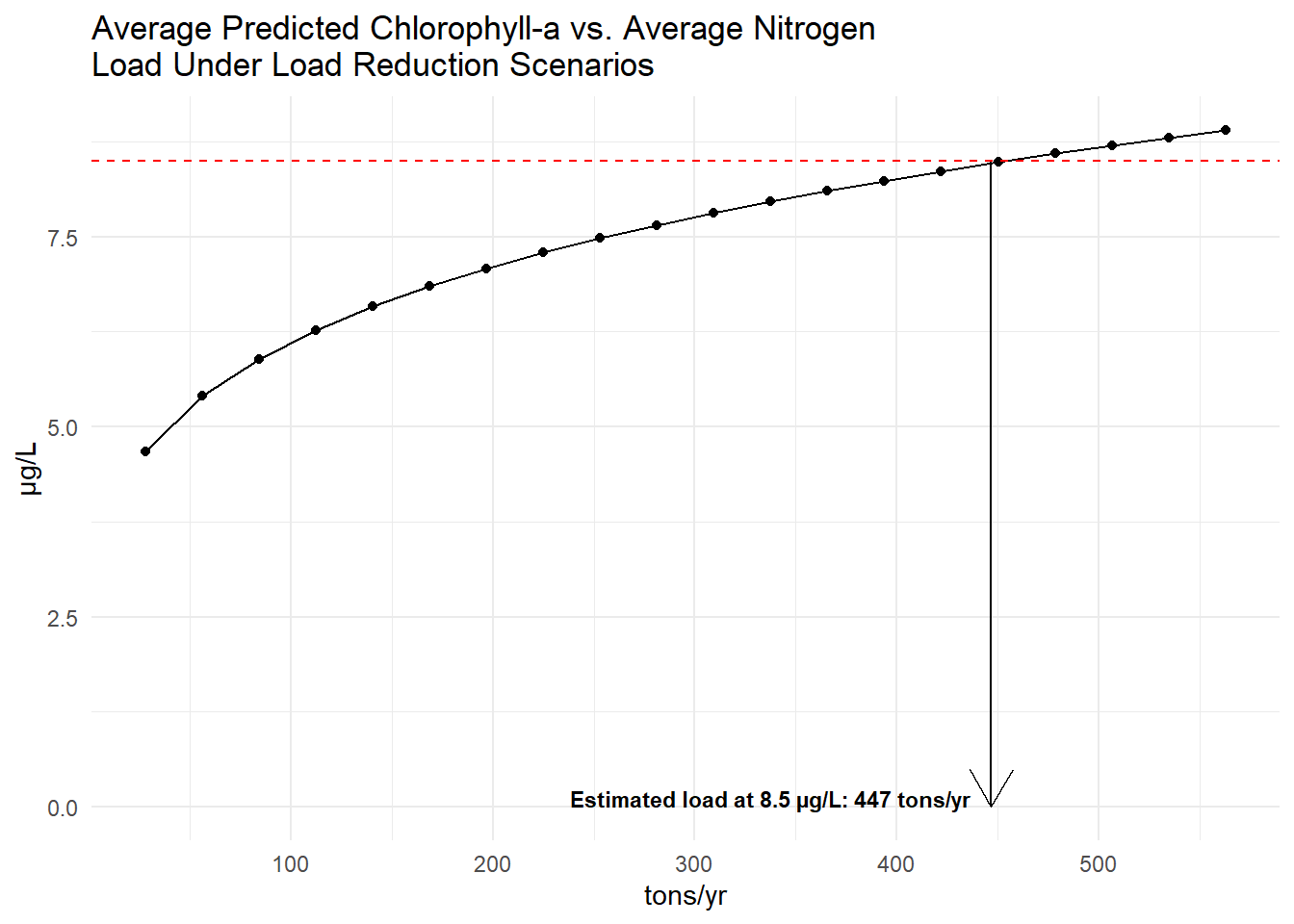 From the load reduction scenarios, the average response of chlorophyll-a to nitrogen load changes was then estimated by taking the average of the annual chlorophyll predictions and the average load estimates for each reduction scenario. The plots below show each point as the average predicted chlorophyll-a versus the average total nitrogen load for each load reduction scenario. The dashed red line indicates the target chlorophyll-a concentration of 8.5 µg/L. The arrow indicates the estimated nitrogen load reductions needed to achieve the target chlorophyll-a concentration based on linear interpolation of the average response curves. The estimated loads needed to achieve 8.5 µg/L chlorophyll-a are 447 tons/year.