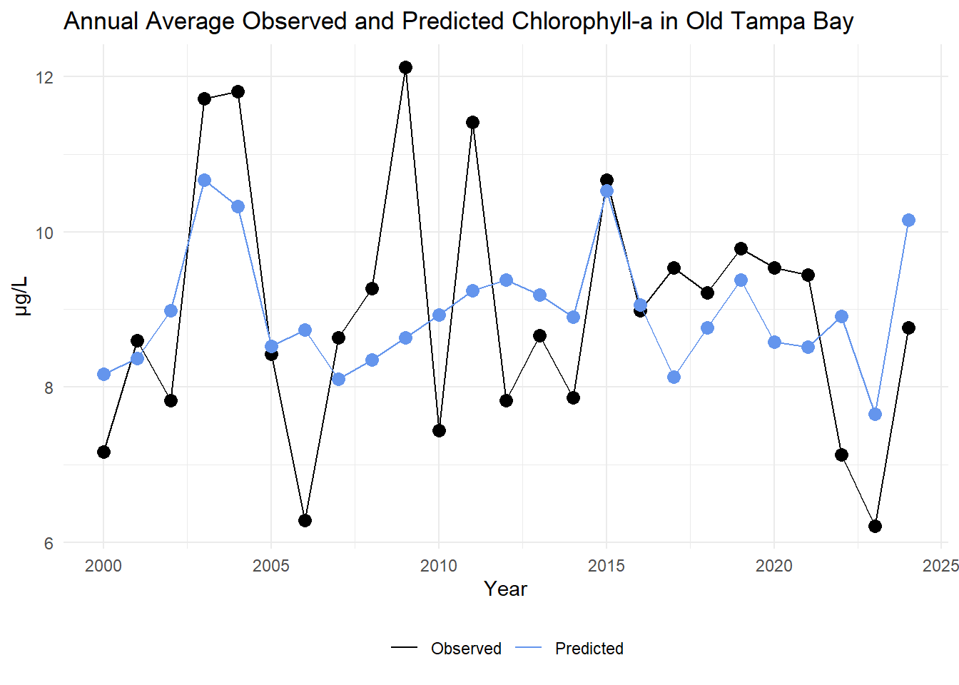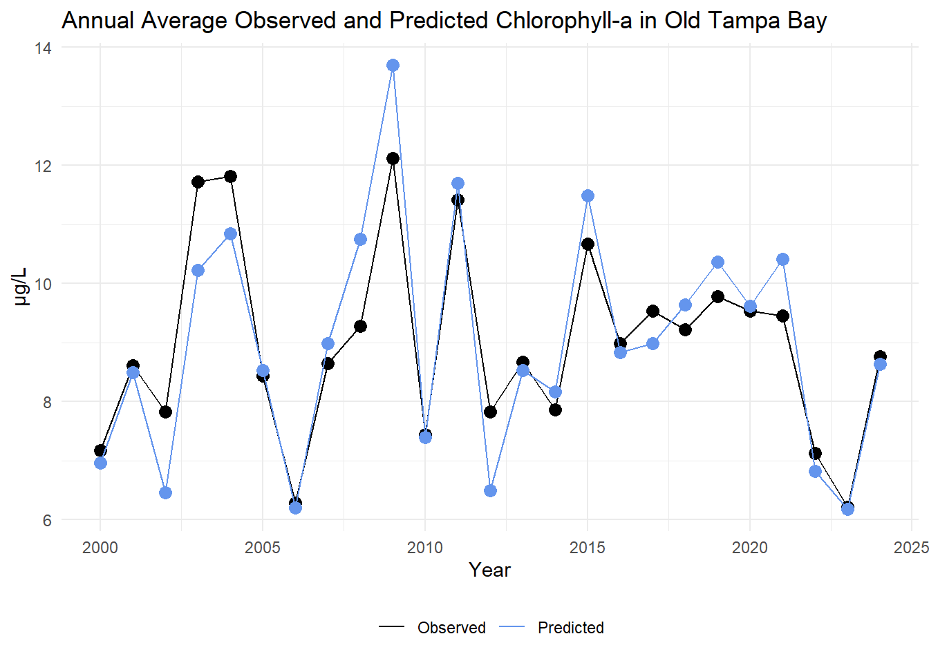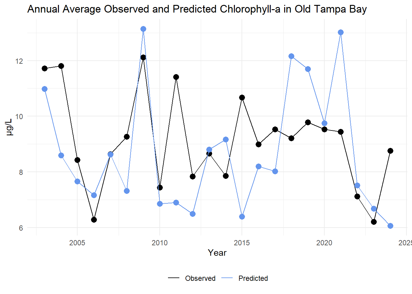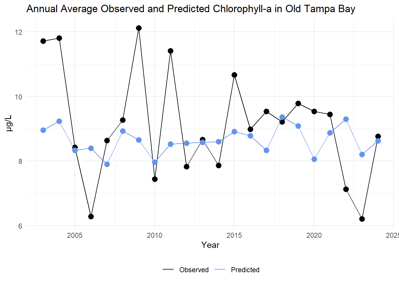 The annual average observed and predicted chlorophyll-a concentrations are compared for Old Tampa Bay below.