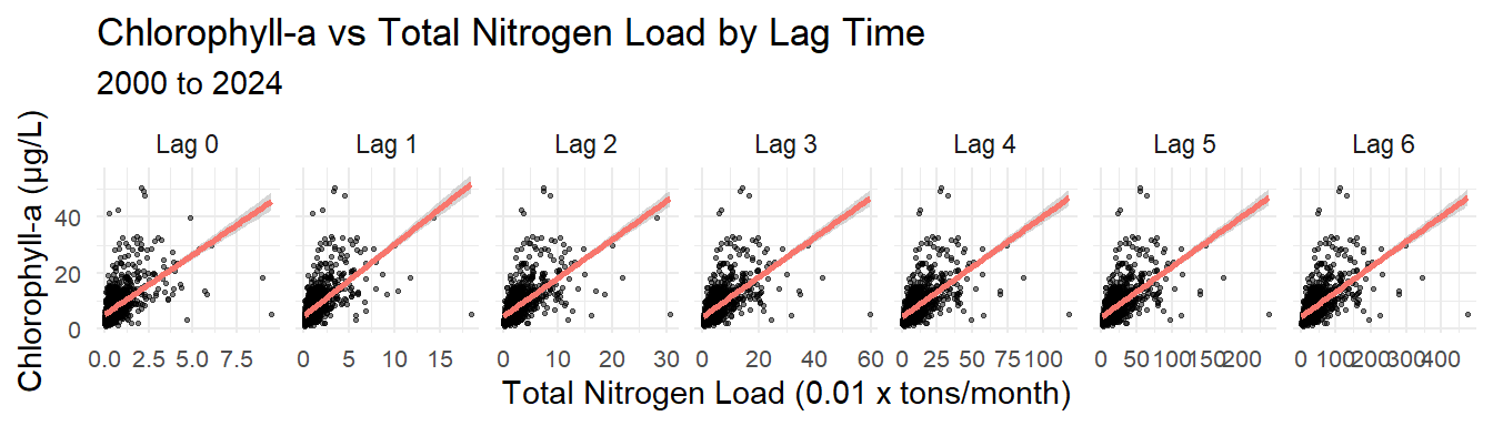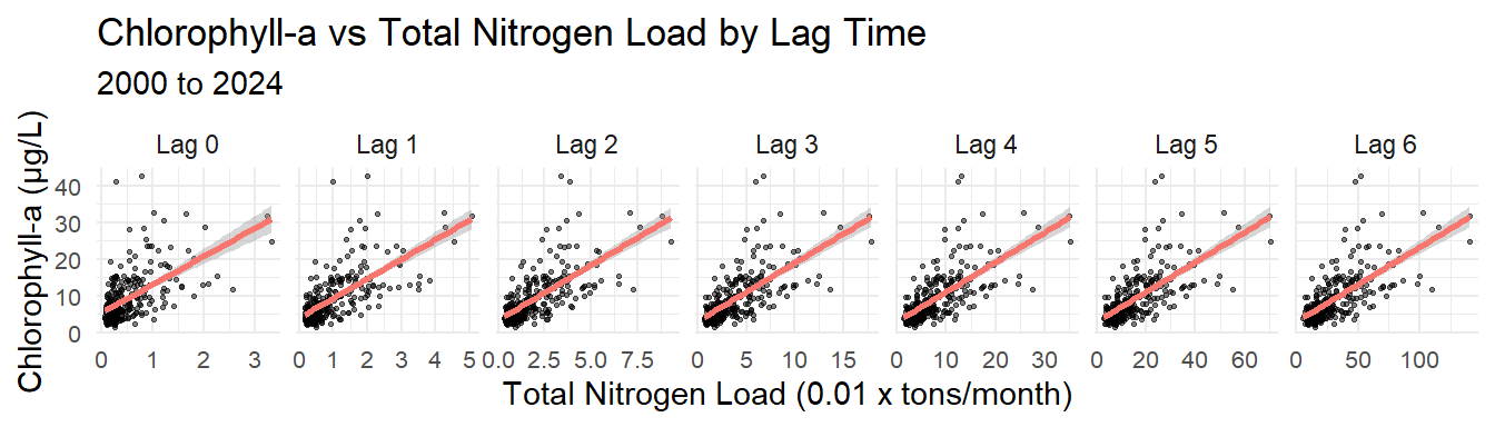 where \(\text{chla}_{t, s}\) is the chlorophyll-a concentration at month \(t\) and bay segment \(s\), \(\alpha_{t, s}\) is the intercept term that varies by \(t\) and \(s\), \(\beta_s\) is the coefficient for the cumulative load term that varies by \(s\), and \(L_{t - 1, s}\) is the cumulative nitrogen nitrogen load evaluated at different lags from \(I_0\) as the present month in the time series to \(I_n\) months for each \(s\).