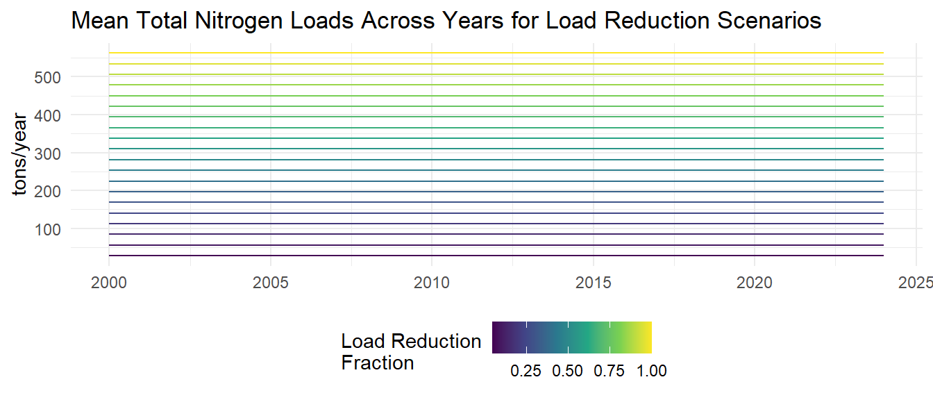 Monthly total nitrogen loads are then summed for the annual nitrogen loads and model predictions are aggregated to the annual average predicted chlorophyll-a concentration for each load reduction scenario.