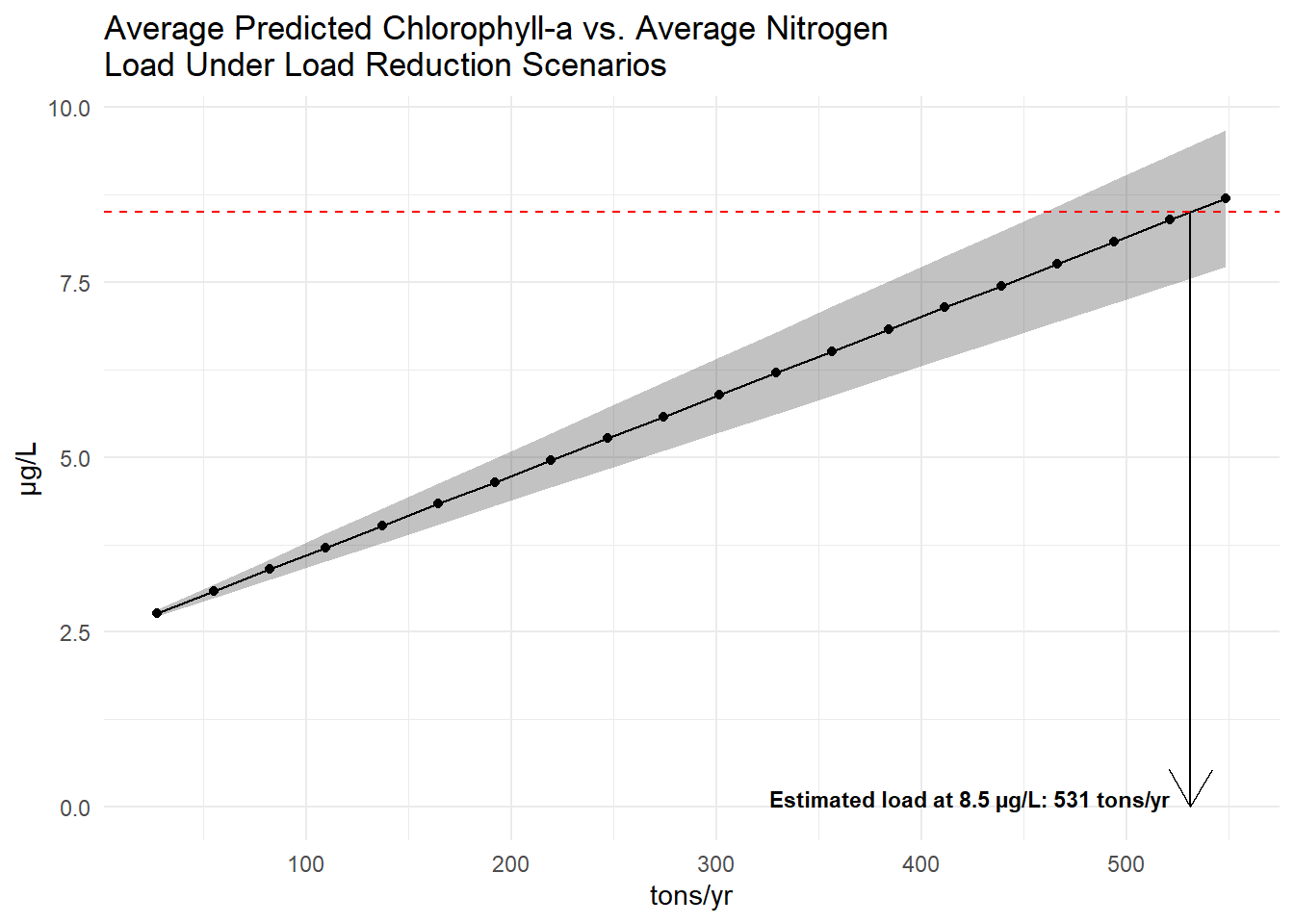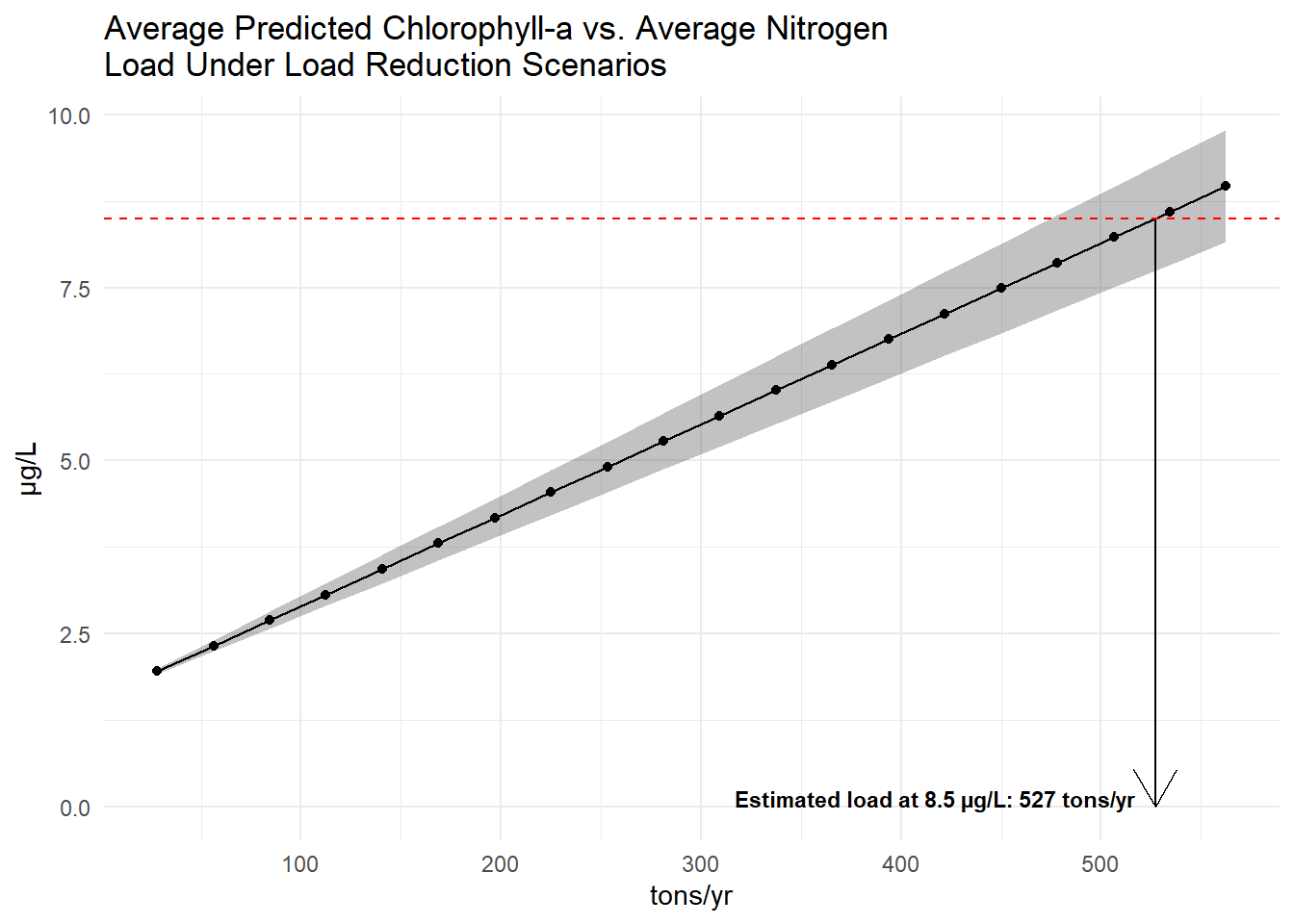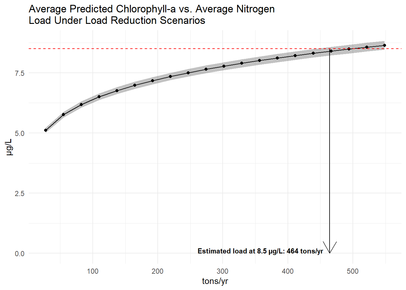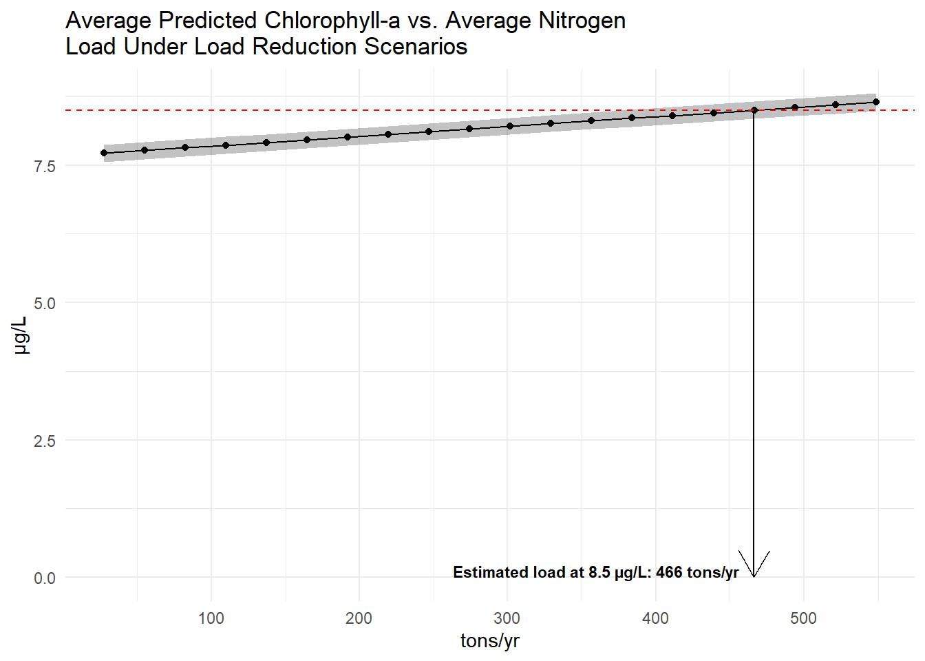 The estimated load needed to achieve 8.5 \(\mu\)g/L chlorophyll-a is 466 tons/year.